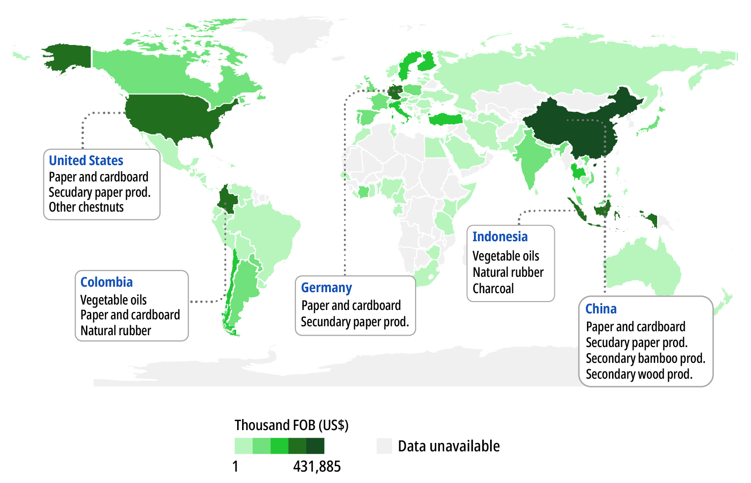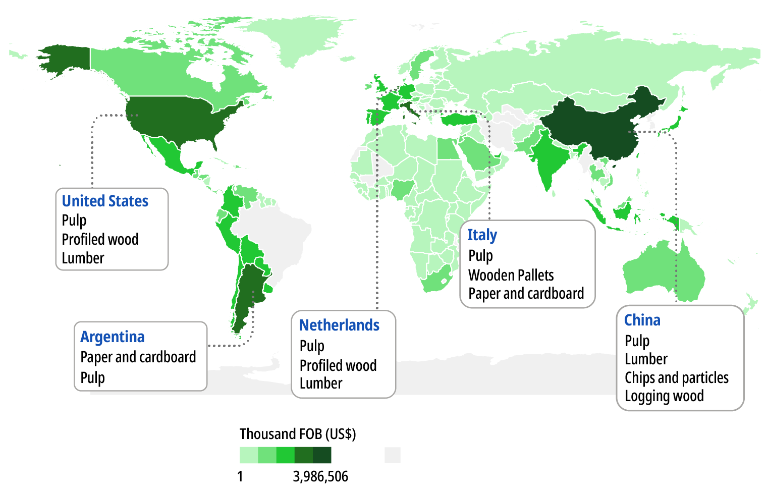 In 2023, Brazil's main trading partners were China ($4 billion FOB) and the United States ($3 billion FOB). The United States mainly imports pulp, profiled wood, and lumber, while China stands out for importing pulp, lumber, and wood chips and particles, as well as log timber.