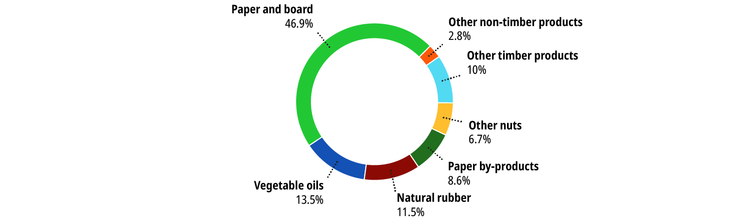 In relation to the amounts invested in the import of Timber and Non-timber Forest Products in 2023, paper and cardboard represented the largest portion, with 47% of the total, followed by vegetable oils, which totaled 13%, and natural rubber, with 11%.