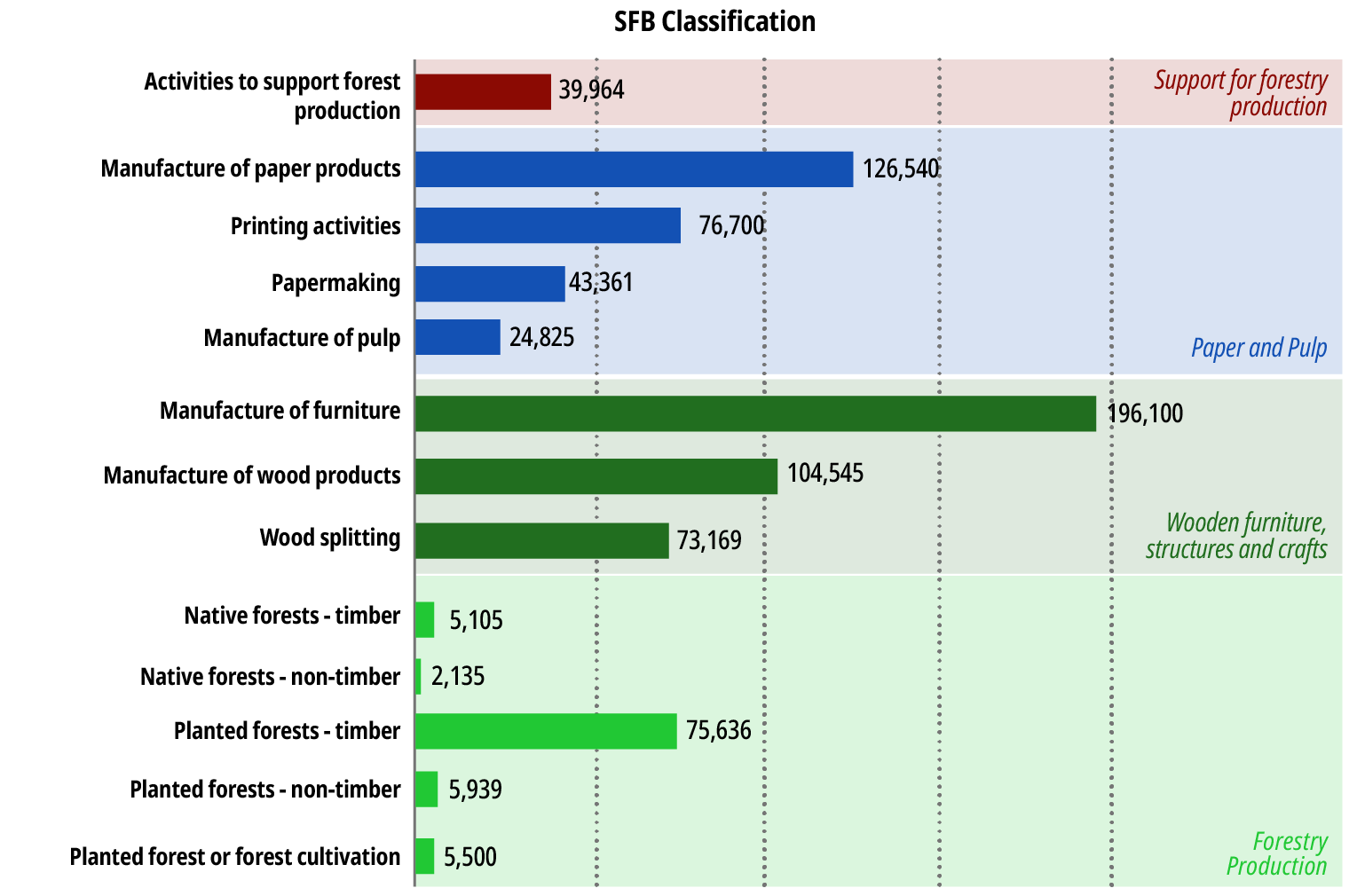 - Wooden furniture, structures and crafts: includes the manufacture of predominantly wooden furniture, the production of floorboards, flooring, railroad ties, planks, ceiling panels, parquet flooring, wooden posts, and the processing of lumber;