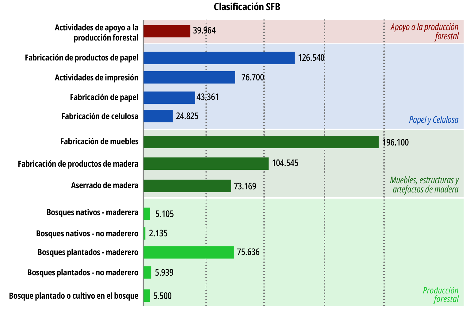- Pulpa y celulosa: incluye actividades de fabricación de celulosa, productos de papel, actividades de impresión y fabricación de papel, cartón y cartulina;