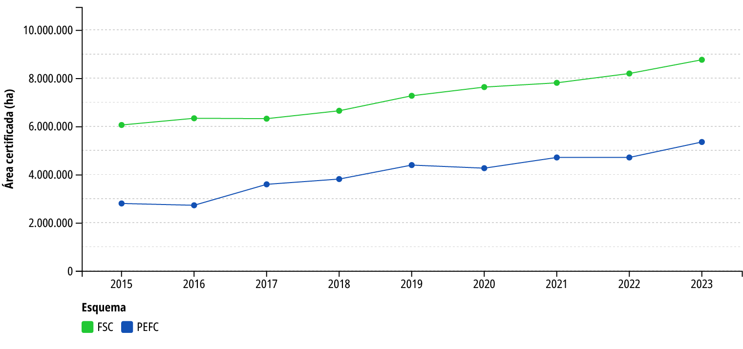 Em 2023, havia no Brasil 32 certificações de cadeia de custódia para produtos de origem florestal e 5.348.267 hectares de manejo florestal certificado pelo Cerflor, provenientes de 38 operações de manejo.