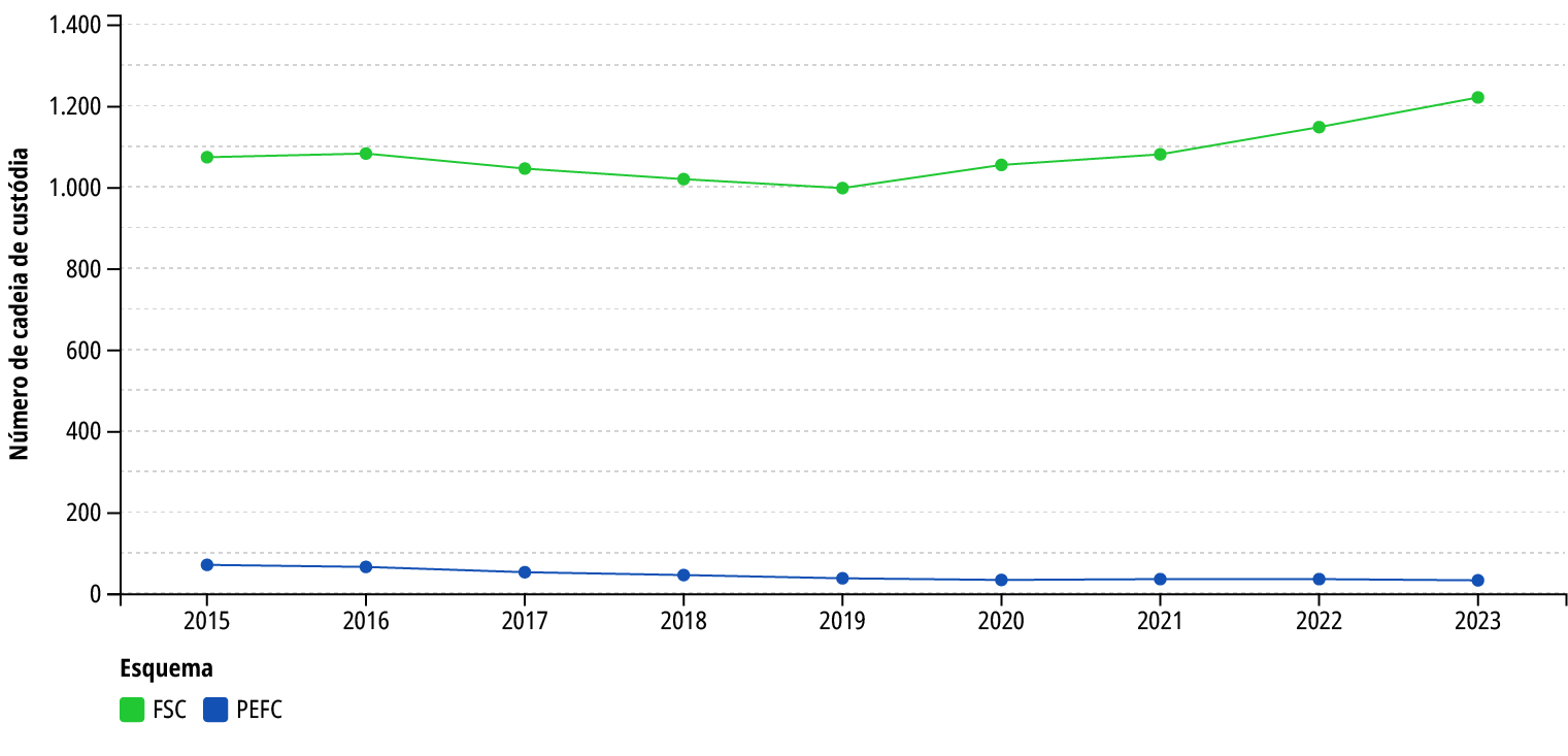 Em relação ao número de cadeias de custódia, em 2023 havia um total de 1.252 cadeias certificadas no Brasil sob os esquemas de certificação FSC e PEFC.